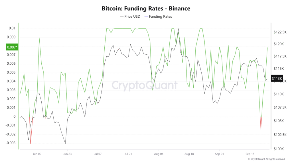 لاحقًا، ارتفعت معدلات التمويل مجددًا، لتصل إلى 0.0067، بينما كان تداول بيتكوين بالقرب من 113,000 دولار أمريكي.