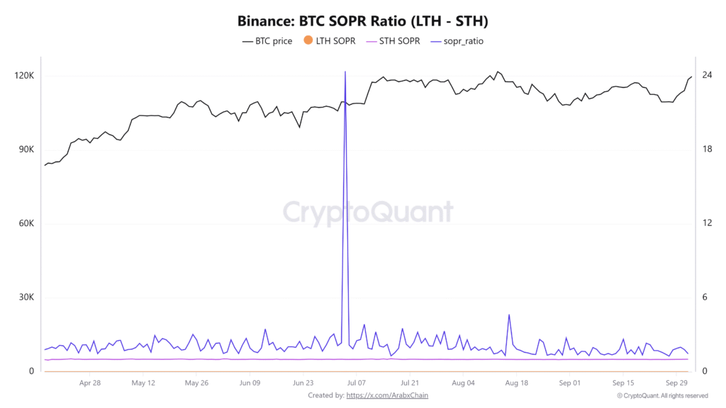نسبة SOPR = 1.45 تشير إلى انحراف هيكلي ملحوظ بين الفئتين. هذا يعني أن متوسط أرباح المستثمرين طويلي الأجل أعلى بنسبة 45% من متوسط أرباح المستثمرين قصيري الأجل.
